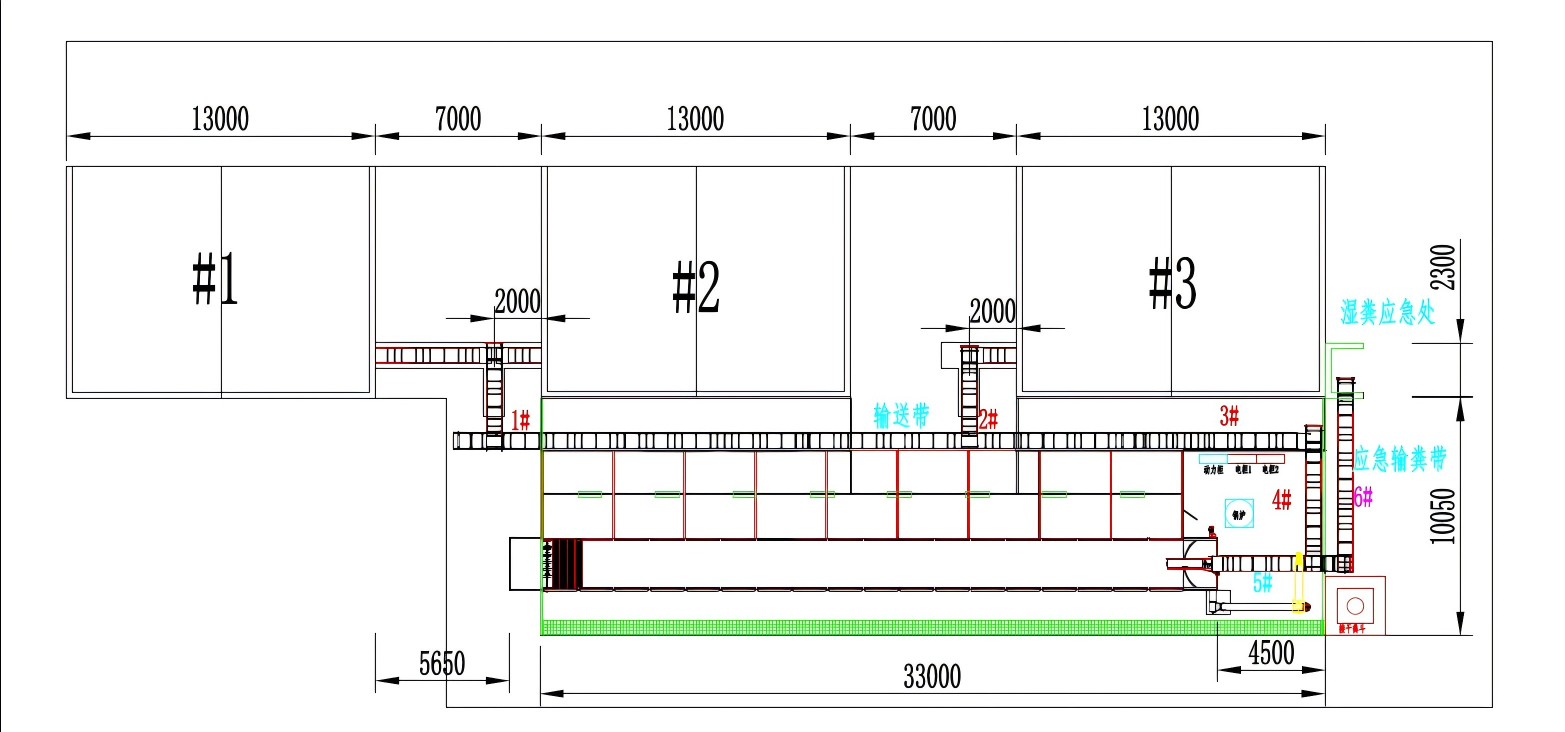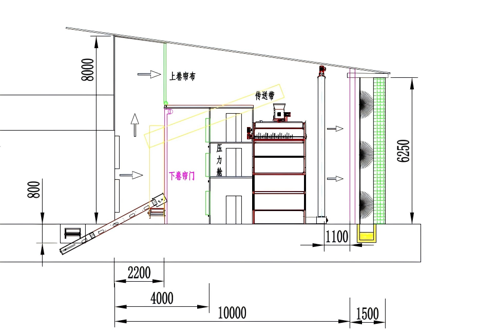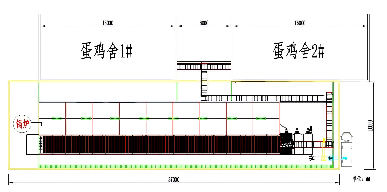 将待干燥的新鲜鸡粪,经由传送带,到干湿混料器内(可左右摆动,混至1/3),将鸡粪反复均匀的分散在粪板上。粪板上有密集圆型透风孔。当禽粪输送至上层粪板的末端后掉落在下层粪板上,继续进行干燥。直至到达最下层粪板末端的(20%以下),由出料绞龙输出干粪,送至干粪仓库。