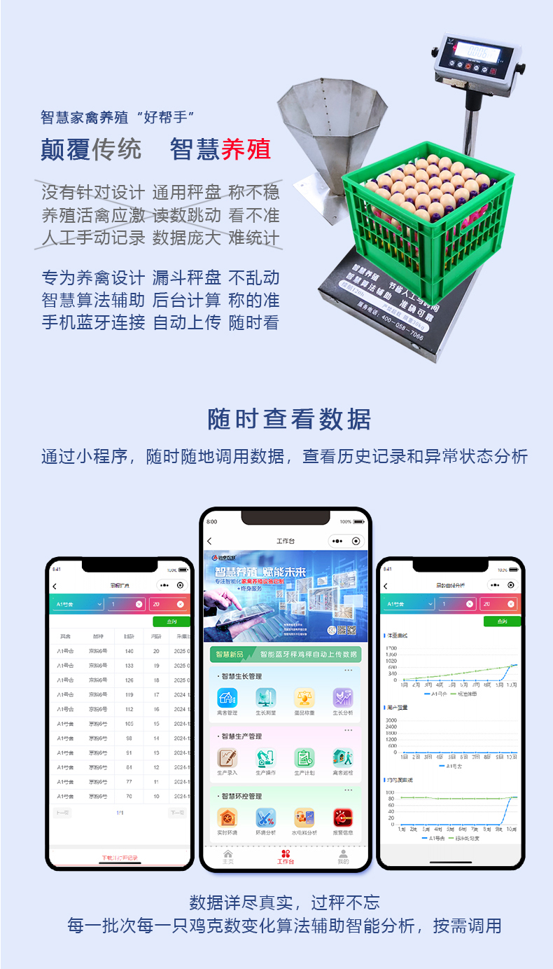 在蛋鸡规模化养殖趋势的背景下,智能蓝牙秤的实用价值尤为凸显。其坚固耐用的机身设计适配养殖场复杂环境,易于清洁维护;操作流程简单直观,无需专业培训即可上手。智能蓝牙秤不仅解决了传统称重的效率与精度难题,更将单一的称重工具升级为养殖精细化管理的 “智慧大脑”,推动蛋鸡养殖业从 “经验驱动” 向 “数据驱动” 转型,为行业高质量发展注入了强劲动力。艾牧智能也正以“硬件+软件+数据服务”的一体化解决方案,不断用科技推动蛋鸡生产力的发展,用科技创造美好生活。